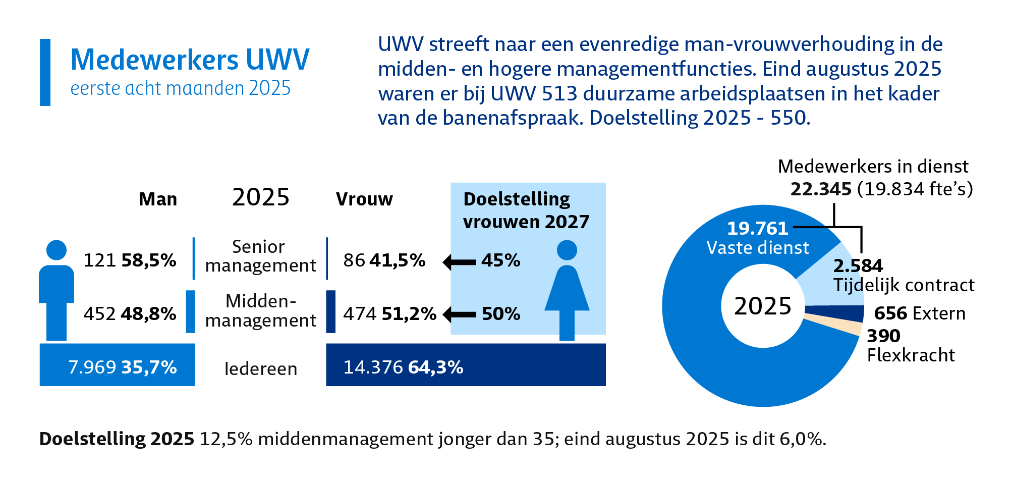 Voor leeftijdsdiversiteit en voor medewerkers met een Indicatie banenafspraak gelden streefcijfers voor 2025. Het doel is dat eind dit jaar 12,5% van het middenmanagement jonger is dan 35 jaar en dat UWV 550 medewerkers met een Indicatie banenafspraak duurzaam in dienst heeft.