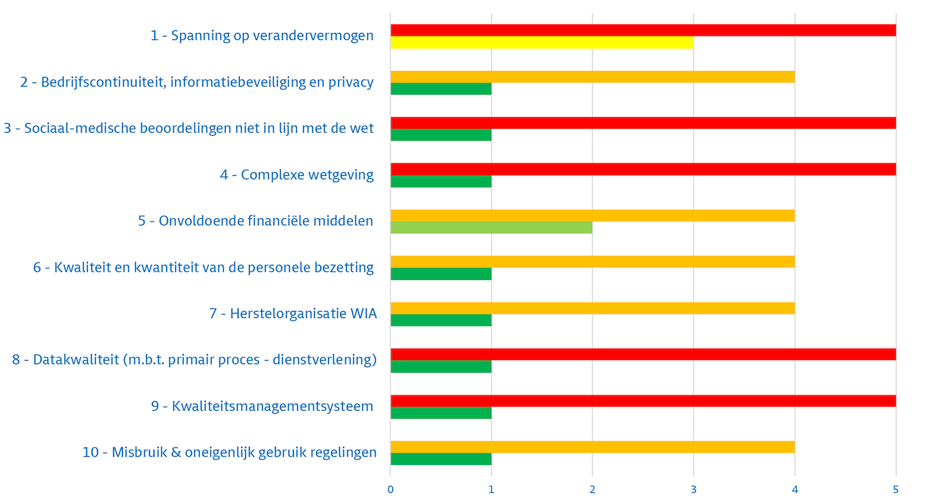 In onderstaand overzicht zijn de tien toprisico’s van UWV opgenomen. De grafiek laat per risico de huidige status van het nettorisico zien met daaronder de vastgestelde risicobereidheid van dit risico. Hiermee geven we aan hoeveel risico we op specifieke thema’s acceptabel vinden. Aan alle toprisico’s van UWV hebben we een eigenaar toegewezen die verantwoordelijk is voor de beheersing van dat risico in relatie tot de risicobereidheid. We monitoren dit actief en rapporteren de voortgang in onze interne kwartaalrapportages. In alle gevallen ligt het nettorisico boven de vastgestelde risicobereidheid. Dit krijgt extra aandacht van de raad van bestuur en in de jaarplannen 2026 van de UWV‑organisatieonderdelen. Gedurende het jaar zullen we dit actief volgen.