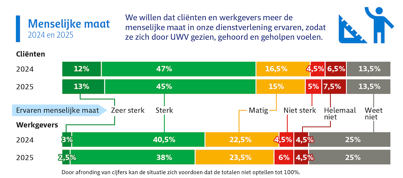 Uit de Menselijke Maat Monitor blijkt dat de beleving van de menselijke maat redelijk stabiel blijft onder uitkeringsgerechtigden. Bij werkgevers is sprake van een dalende trend in de beleving van de menselijke maat, vooral bij de kleinere werkgevers. Bij zowel werkgevers als werknemers wordt de menselijke maat zeer sterk positief beïnvloed door de mate van contact met UWV (hoe meer contact hoe positiever). Die trend is duidelijk zichtbaar en daar liggen de verbetermogelijkheden. Daarnaast lijkt er relatief veel ruimte om de menselijke maat te verbeteren bij cliënten die met meerdere integrale klantreizen hebben te maken.
